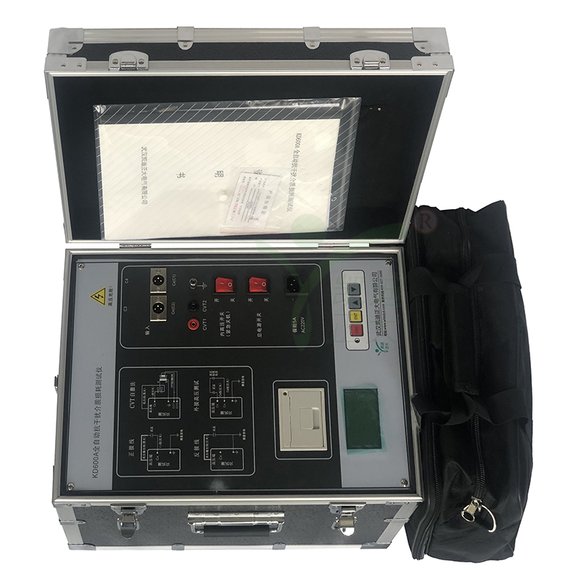 KD600A全自動變壓器介質損耗測試儀是發電廠、變電站等現場全自動測量各種高壓電力設備介損正切值及電容量的高精度儀器。由于采用了變頻技術能保證在強電場干擾下準確測量。儀器采用中文菜單操作,微機自動完成全過程的測量。