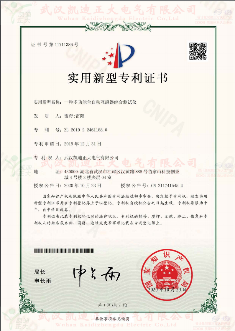 凱迪正大實用新型專利證書:一種多功能自動互感器綜合測試儀。