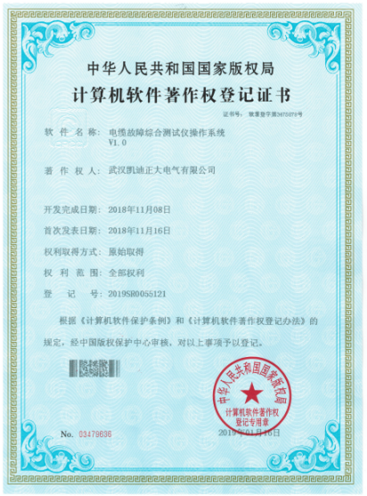 2019年,武漢凱迪正大電氣有限公司新力之作,榮獲中華人民共和國(guó)國(guó)家版權(quán)局《計(jì)算機(jī)軟件著作權(quán)登記證書(shū)》系統(tǒng)計(jì)算機(jī)軟件著作登記以及質(zhì)量管理體系認(rèn)證證書(shū),其中包含電纜故障綜合測(cè)試儀操作系統(tǒng)V1.0(證書(shū)號(hào):軟著登字第3475878號(hào))、氧化鋅避雷器帶電測(cè)試儀操作系統(tǒng)V1.0(證書(shū)號(hào):軟著登字第3478045號(hào))、高壓開(kāi)關(guān)動(dòng)作特性測(cè)試儀操作系統(tǒng)V1.0(證書(shū)號(hào):軟著登字第3478053號(hào))、變頻串聯(lián)諧振耐壓試驗(yàn)裝置操作系統(tǒng)V1.0(證書(shū)號(hào):軟著登字第3475581號(hào))、電纜震蕩波局放定位系統(tǒng)操作系統(tǒng)V1.0(證書(shū)號(hào):軟著登字第3475874號(hào))等證書(shū)共計(jì)5份。權(quán)利取得方式:原始取得。權(quán)利范圍:全部范圍。