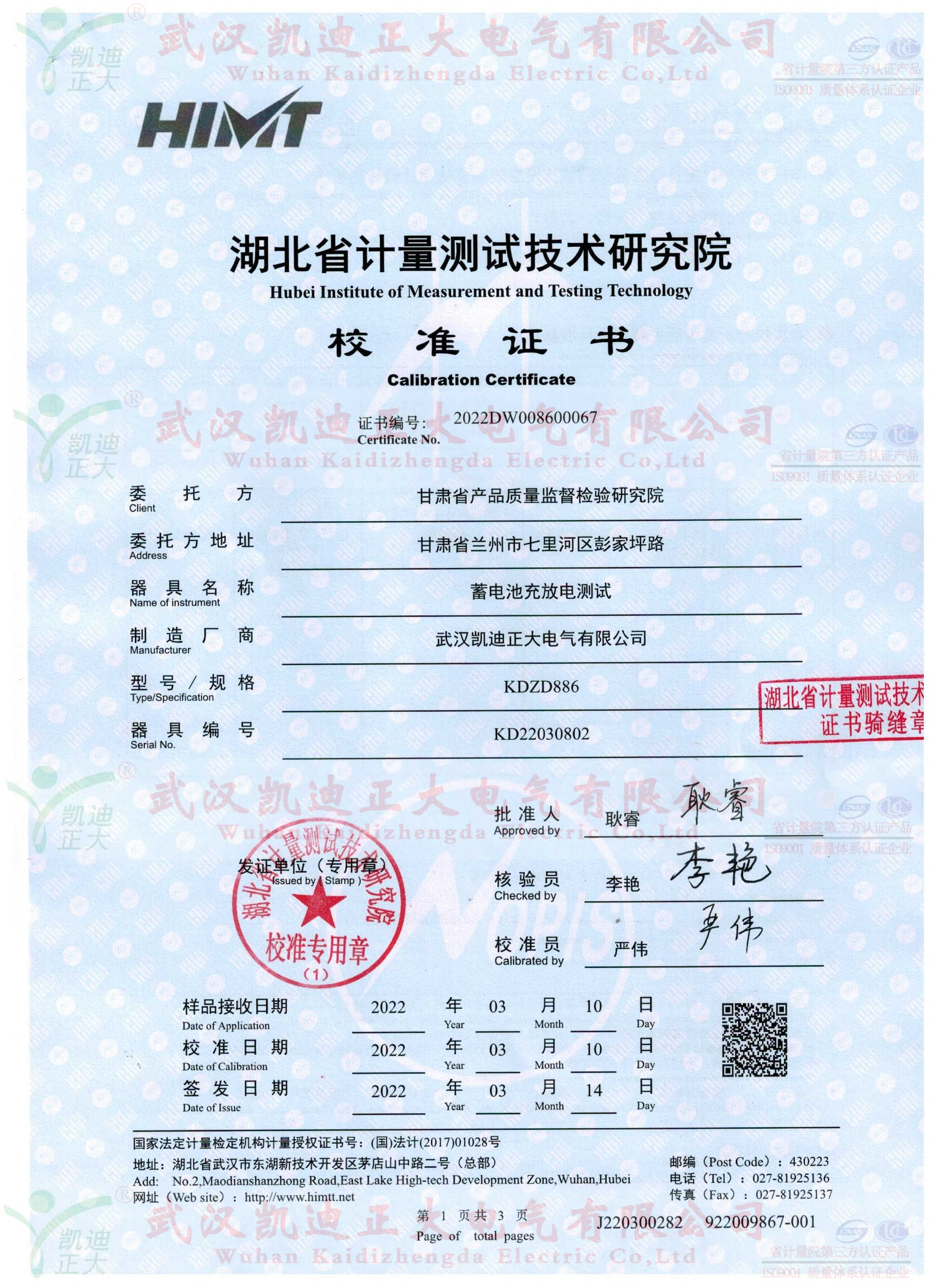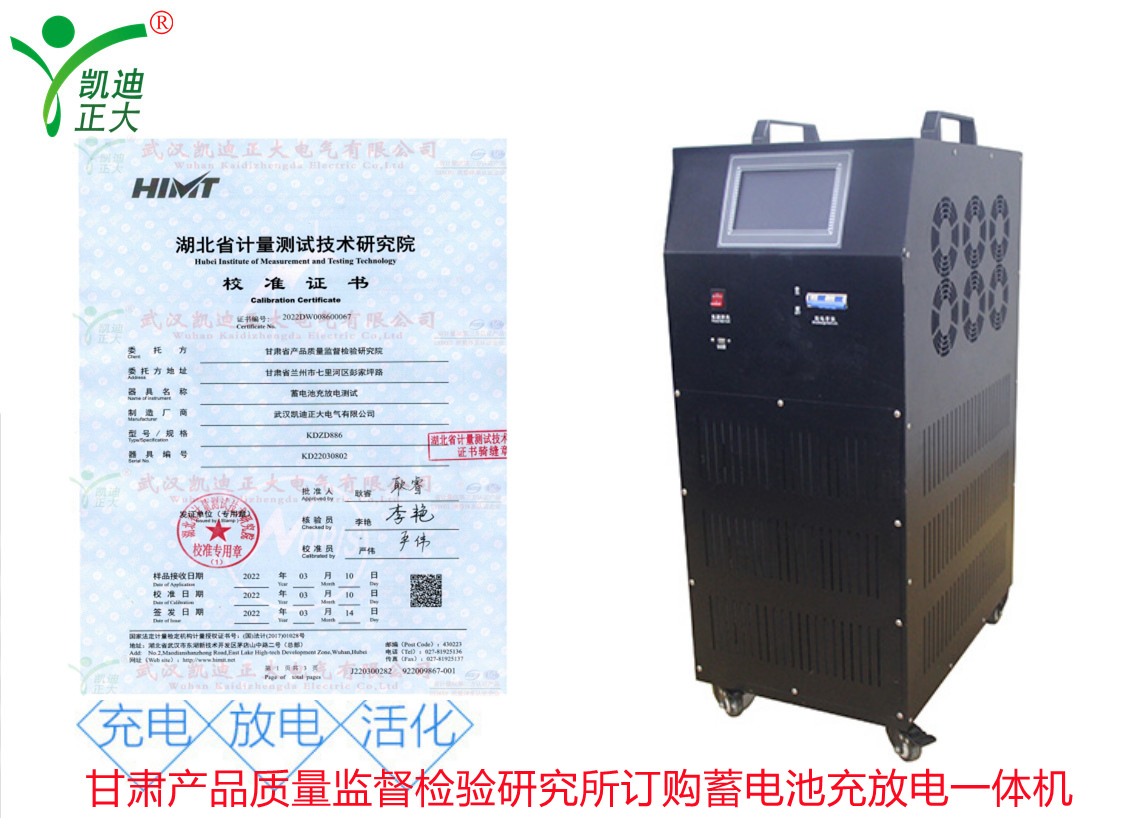 甘肅省產(chǎn)品質(zhì)量監(jiān)督檢驗(yàn)研究院在了解我司KDZD886蓄電池充放電測(cè)試儀集蓄電池恒流放電,智能充電,活化于一體等功能。隨即采購(gòu)KDZD886蓄電池充放電測(cè)試儀,要求獲得湖北省計(jì)量測(cè)試技術(shù)研究院的檢定合格報(bào)告。