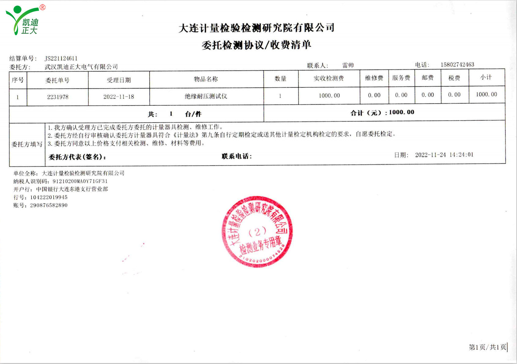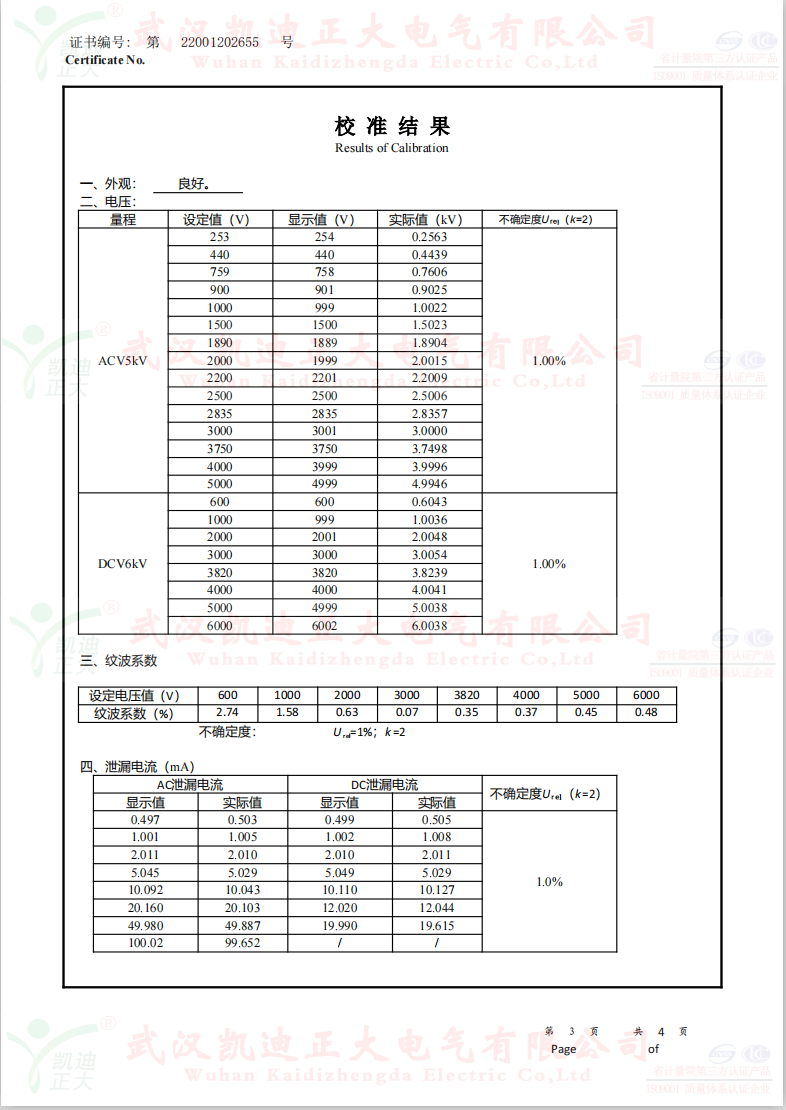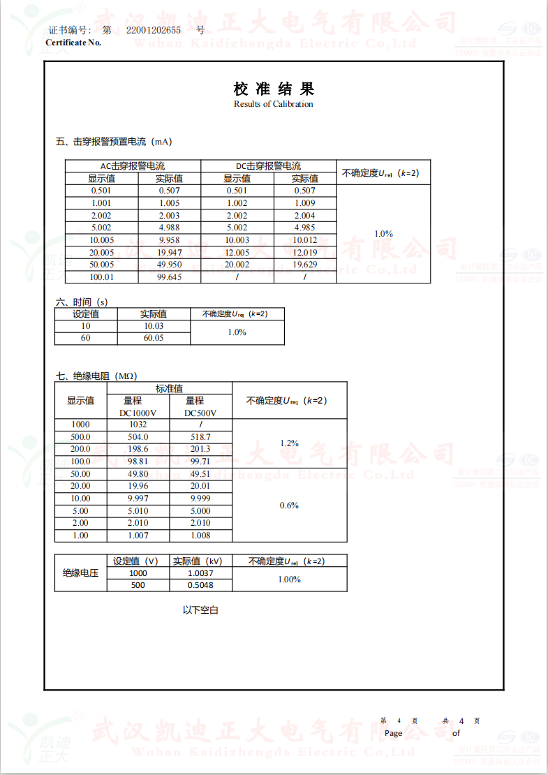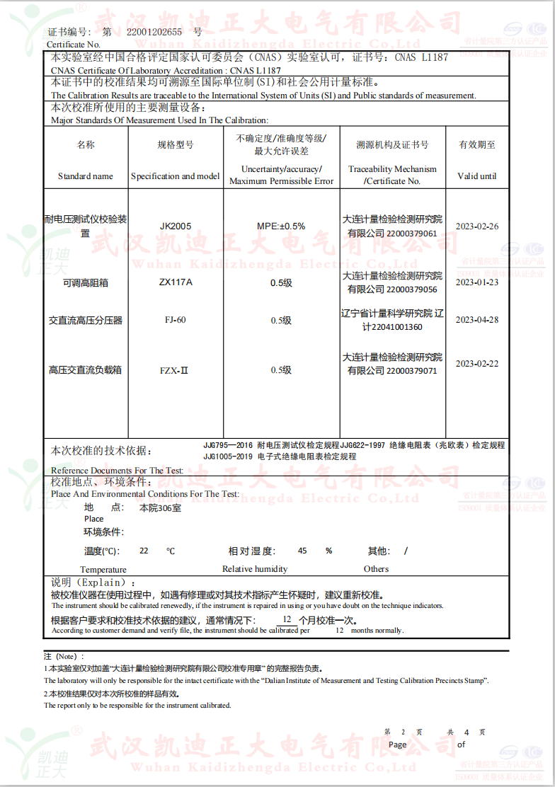 低壓成套開關柜KD7742智能耐壓絕緣測試儀根據公司制度標準需要獲得中國認可國際互認校準CNAS檢定機構,大連計量檢驗檢測研究院有限公司出具《KD7742智能耐壓絕緣測試儀校準證書》,證書編號:第22001202655號;使用耐電壓測試儀校驗裝置(溯源機構大連計量檢驗檢測研究院)、ZX117A可調高阻箱(溯源機構大連計量檢驗檢測研究院)、FJ-60交直流高壓分壓器(溯源遼寧省計量科學研究院)、FZX-II高壓交直流負載箱(溯源機構大連計量檢驗檢測研究院)等檢定設備。