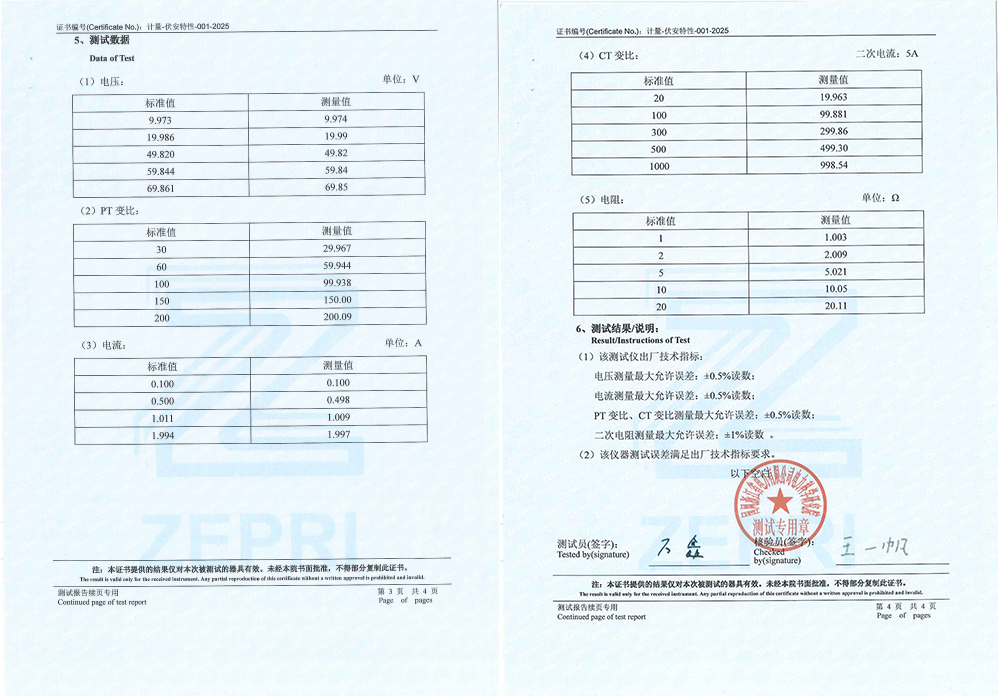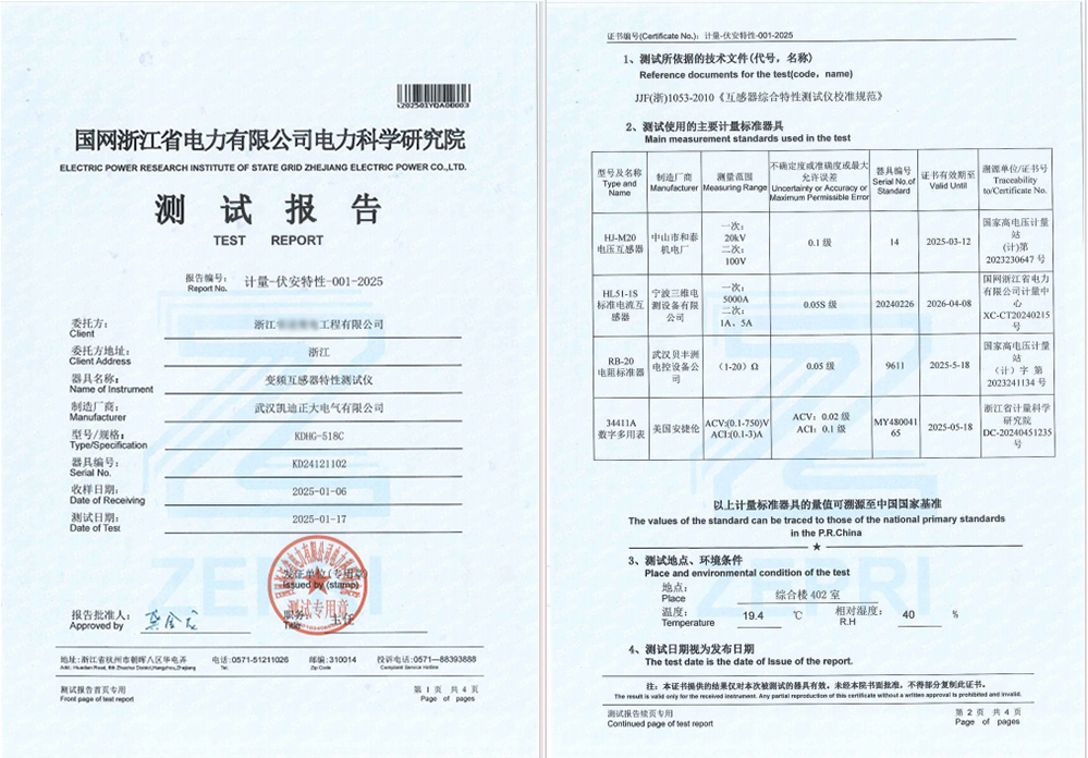 浙江某工程有限公司采購凱迪正大電氣生產的KDHG-518C變頻互感器特性測試儀,在國網浙江省電力有限公司電力科學研究院的嚴格校準測試中表現穩定和可靠,順利通過各項性能指標的檢測,并成功獲得校準測試報告。彰顯了KDHG-518C變頻互感器特性測試儀的性能和質量,驗證了市場客戶在電力設備采購方面的專業眼光和嚴苛標準。