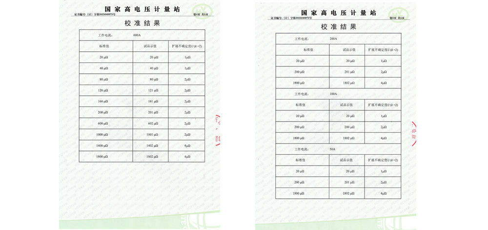 在校準(zhǔn)過(guò)程中,國(guó)家高電壓計(jì)量站采用了最大充許誤差為±0.1%讀數(shù)的直流大功率標(biāo)準(zhǔn)電阻作為校準(zhǔn)器具,校準(zhǔn)環(huán)境為溫度21℃℃、濕度56%RH。校準(zhǔn)內(nèi)容包括對(duì)測(cè)試儀在600A、200A、100A、50A不同電流下的測(cè)量結(jié)果。經(jīng)過(guò)一系列嚴(yán)格的測(cè)試和比對(duì),KDHL-600A回路電阻測(cè)試儀成功通過(guò)了校準(zhǔn)。