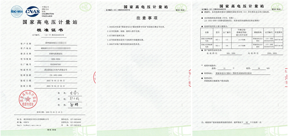 近日,國(guó)網(wǎng)湖南省某有限公司采購(gòu)的武漢凱迪正大KDHL-600A回路電阻測(cè)試儀,順利通過(guò)了國(guó)家高電壓計(jì)量站的嚴(yán)格校準(zhǔn),并獲得了校準(zhǔn)證書。