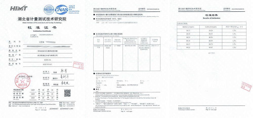 江蘇某灌溉單位采購武漢凱迪正大KDJS-8A型全自動安全工器具試驗裝置,經湖北省計量測試技術研究院嚴格校準,取得了編號為2025DW028600156的校準證書。